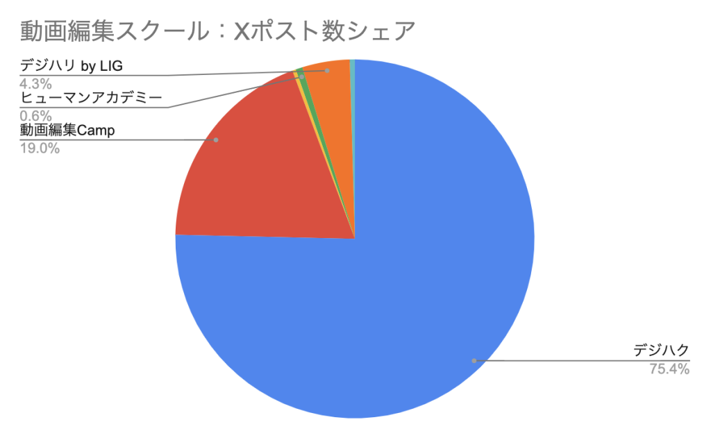 調査の結果、動画編集スクール「デジハク」の口コミ数は競合と比べて圧倒的に多いことが明らかになりました。また、投稿数の多さに対してネガティブな口コミの割合が非常に低い点も特徴的であり、「デジハク」が提供するサービスの満足度が高いことが伺えます。